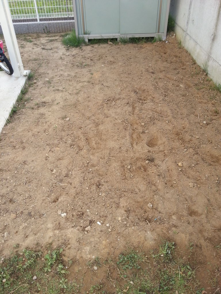 理由は、庭の掘り起こし & 根っこ取りが終わっていた部分が全体の2/3で、その部分にクラピアを植えたためです。